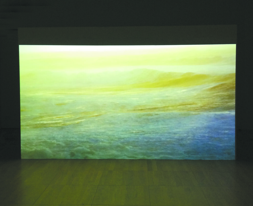 Manifesting a similar approach towards the subject matter of seascapes, North of the West (2017) is a new single-channel moving image work developed in collaboration with cinematographer Padraig Cunningham. Recorded at Mullaghmore – an exposed peninsula on Sligo’s Atlantic coastline – the film depicts scenes of turbulent, foaming water, evocative of Russian filmmaker Andrei Tarkovsky’s haunting portrayal of a sentient ocean in his 1972 film Solaris. Gustave Courbet’s monumental 1870 painting, The Wave, also comes to mind, when the camera zooms out to reveal a tormented, glowering sky in a dyadic relationship with the sea. This hypnotic piece is adequately projected within the space; however, it could benefit from future screenings at a larger, more cinematic scale, as I feel its enigmatic drama could be more persuasively communicated in a fully immersive setting.