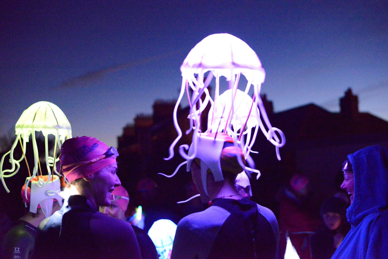‘Beyond Islands’ took people on a journey, with participants choosing whether to travel by land (walking) or by water (swimming). Along the way, the audience encountered performances and readings of commissioned and archival texts, video and animation projections, illuminated floating sculptures and a large shadow wall. The event started across the bay on the South Strand as the sun went down. After an introduction by the narrator, Rosaleen Ní Shúilleabháin, the swimmers and walkers parted ways, with Rosaleen guiding the walkers. The swimmers followed a smack of illuminated, flashing jellyfish towards the sea, where they encountered a performance by synchronised swimmer, Aoife Drumm.
