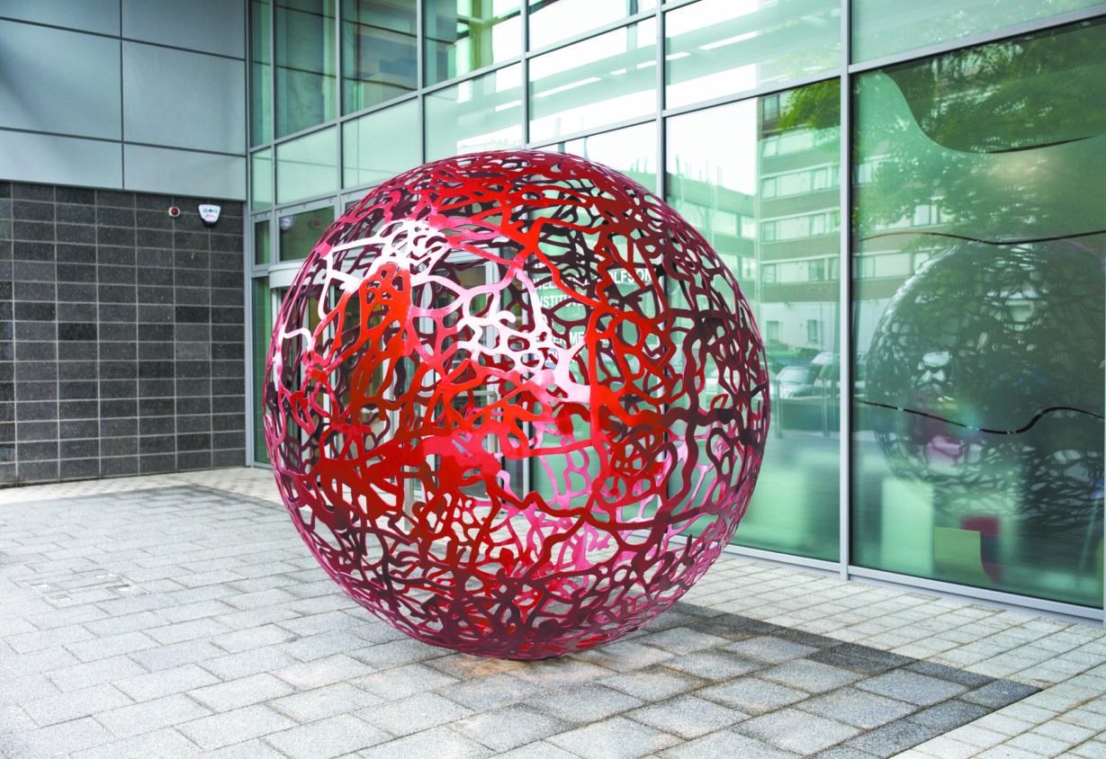 Aesthetically, Capillarium is instantly recognisable as relating to the body. Its branch-like organic motif and orbital shape resemble various internal structures; its surface is the colour of blood. The title is derived from vasorum capillarium, Latin for ‘capillaries’ – the fine branching network of blood vessels that connect arteries and veins. The sculpture’s industrial finish appears wipe-clean and hygienic like a piece of medical equipment. Capillarium makes visible the internal structures inside each of us with the impassive, clinical directness of a 3D scientific model found in a biology classroom.