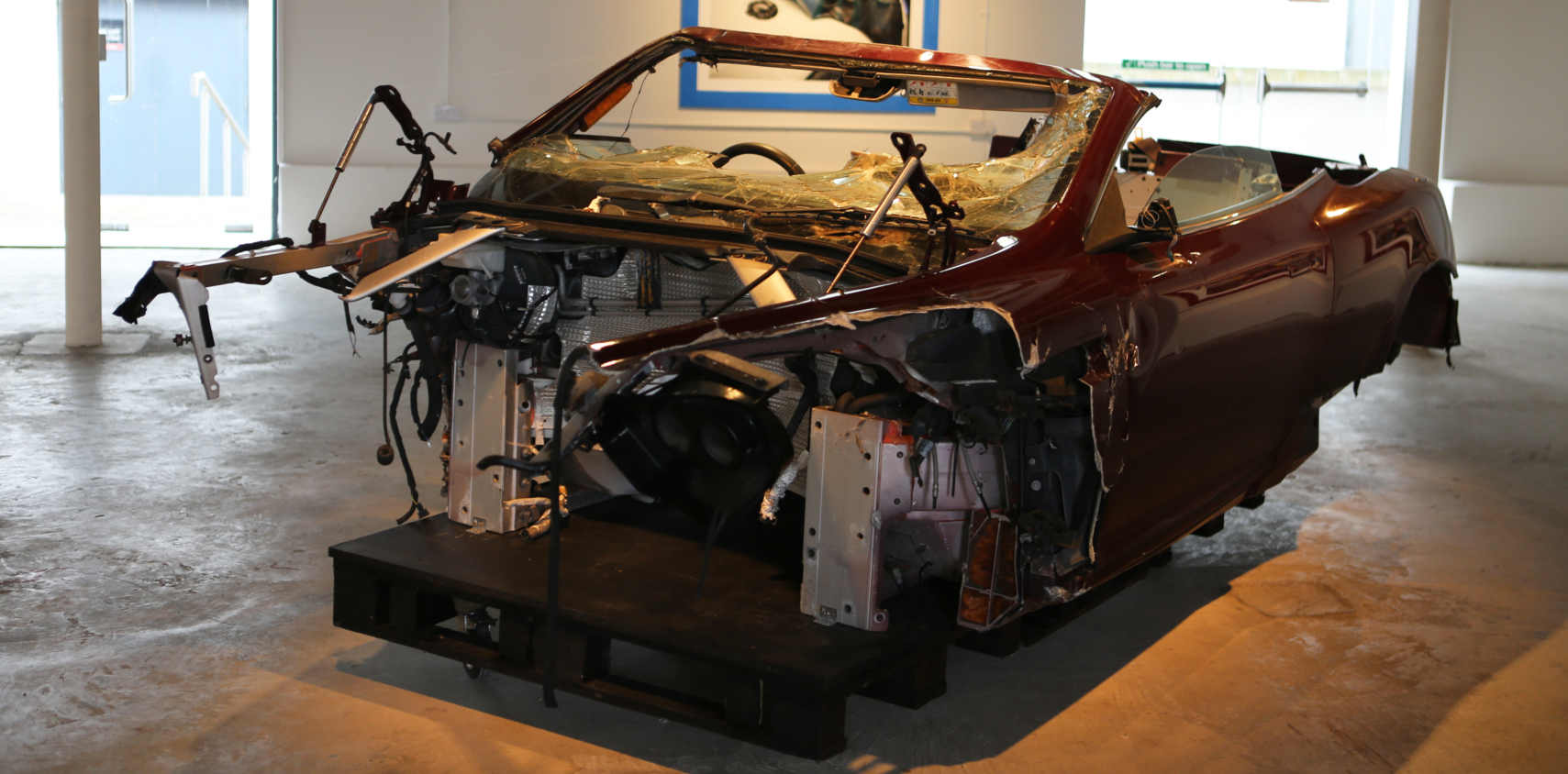 This exhibition offers multiple facets of the Aston Martin which sustains a richness and buoyancy. One can move between marvelling at a car in production, to being hit by a quote such as “put your clothes back on and I’ll buy you a lollipop”, all the while a wreck in the room lingers. So, circulating versions of one particular thing is effective, but the repetition of the Aston Martin can be jarring. It starts and ends as metaphor which can skirt around an opportunity to unpack the complexities and details of the issue it is addressing. Voice, symbol and metaphor of the male has the floor. This is clearly intentional, but textures of multiple voices are missed. An absence that does work is the lack of figuration. Only objects are visually depicted and this carries the show. It makes space for a sort of reset button on the identity of the Aston Martin. The car is laid out in a range of states: vulnerable, pregnant and morbid. Never revealed in full, it feels ready to be reframed by a new driver. This offering rattles in the space of justice, not enough but making useful noise.