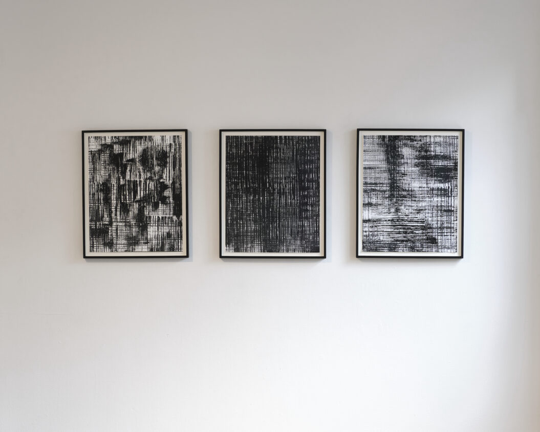 Joyce, Grid #2, and Grid #3 (2018) of similar dimensions, all feature grid-like patterns. At first, they seem like charcoal rubbings – not of natural objects, but rather of industrial materials, such are their semi-regimented compositions of horizontal and vertical elements. Their treatment is reminiscent of the threshold effect in image manipulation software, the hard contrast of black and white suggesting raised surfaces cast into relief. On closer inspection, however, Joyce, for example, contains smudges and tones, textures, thin lines and dusty particles – like powder chopped into lines with a razor.