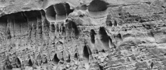 Ben Rivers’s film, Ghost Strata, currently showing at VISUAL Carlow until 18 October, was my first excursion to see art after lockdown. The title of the work is borrowed from his 2009 filmed conversation with geologist Professor Jan Zalasiewicz, who talks about the anthropological traces on geology, made in recent centuries. Discussing the ‘manhandling’ of the earth, he gives the example of the Park Tunnel in Nottingham, built in 1855. This passage tunnel is carved out of the city’s soft sandstone, exposing sedimentary layers of ‘solidified time’. ‘Ghost Strata’ is the term used to describe the scooped bedrock – the imagined and theoretical layers that no longer exist, due to this human intervention of a vehicular route for horse-drawn carriages. The term is contradictory, denoting a lasting ephemerality, an absent presence and an invisible impact. The mystery conveyed in the film’s title also comments on Rivers’s dedication to 16mm film; images are only made visible through photographic processing – the unknown is eventually revealed.