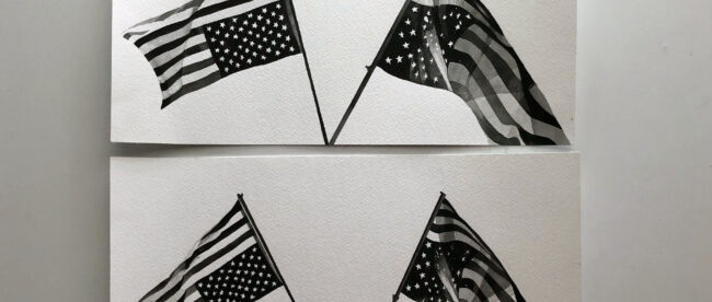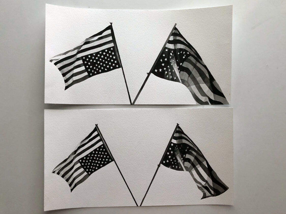 Matteucci has taken a more formal approach, arranging the works by theme, removed from any clutter. John Rainey’s sculpture of different brightly coloured hands, titled To think about things that appear to be separate, is seen in scale next to Joy Gerard’s black ink drawings of upside-down American flags, Sign of Distress Version 1 and Version 2. They complement each other both aesthetically and in terms of subject matter, with their opposing tones and references to the Black Lives Matter movement.