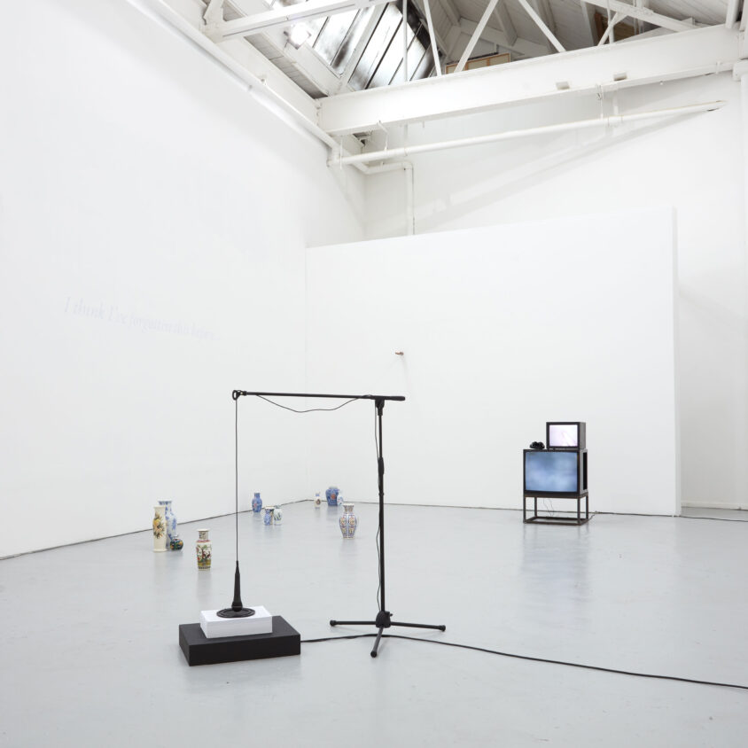 Jonathan Mayhew has contributed two separate works: one, a white vinyl text piece which reads “I think I’ve forgotten this before”, fading into the white of the gallery walls; the other, titled This is water, is a collection of decorative ceramic vases, dotted carefully around the floor, which hold USB sticks like flowers. Memory takes a tangible quality – it is hidden, stored, slipping from your mind. Instead of simply externalising our memory, like writing does, Mayhew’s vessels remind us how algorithms shape, prompt and mirror our own. Identity flows between user and avatar, with the pots and text acting as proxies.