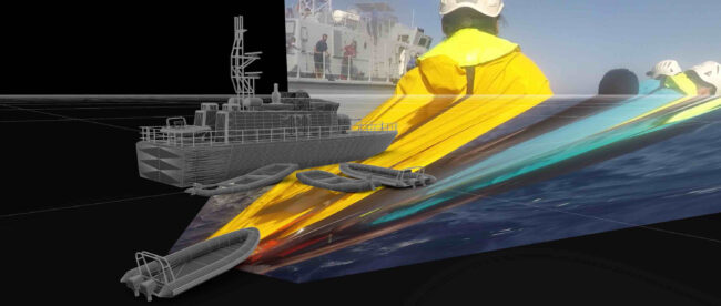 These artworks, defined by intimacy and personal encounter, are contrasted with the more violent and inhumane dimension of the sea. Forensic Oceanography / Forensic Architecture occupy the exhibition’s centre in Gallery C. Through this documentary installation, we gain harrowing insights into the experience of migrants at sea. These videos and timeline act as a stark reminder of injustices that the dispossessed face. Through the headset we hear the real-life scenario of highly charged rescue operations by the Libyan Coastguard and NGO vessels in the Mediterranean Sea. Seemingly, ‘engine fishers’ are often present at these rescues, sometimes carrying Kalashnikovs, to take engines from the boats before the migrants are rescued. In what Forensic Oceanography refers to as “liquid violence”, more than 30,000 migrants have died at sea over the last 30 years.