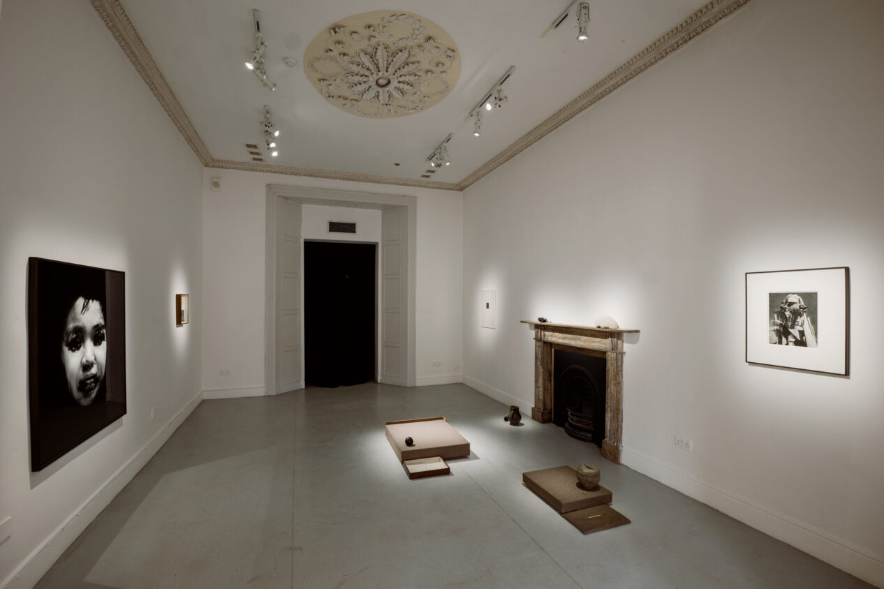 Ailbhe Ní Bhriain’s startling image of a face, Untitled (Adversary) (2020), is made up of overlaid AI generated portraits which echo the process of machine learning as it evolves new identities – an unnerving indication of digital means to reconfigure ourselves. Her work circles the question of “slipperiness in representation and how we construct meaning – within this the ways in which, culturally, meaning is constructed for us”.² Her recent exhibitions use the title of the 1565 text, Inscriptions or Titles of the Immense Theatre – the earliest instruction manual for creating private collections and museums – setting out a basis to collect objects which reinforces Western Imperial assumptions, here disrupted by Ní Bhriain’s display of delicate and exquisitely placed objects, combining the natural, geological and archaeological. There is a visual rhyme with Alice Rekab’s votive objects, displayed as part of a complex installation, including a short film, showing the tactile surfaces of the earth and the extraction and exploitation of materials from it.