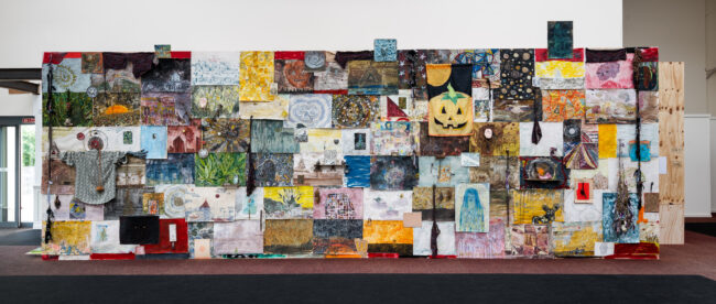 Eleven brightly coloured textile works drape over wooden stands, the products of felting workshops held over two years by Hana Miletić – an endeavour in community building and an ode to the traditional ‘handwork’ of the artist’s upbringing in former Yugoslavia. Their bright colours and tactile nature offset Deirdre O’Mahony’s Erratics (1995-6), a series of large paintings on unstretched canvas, suspended from the ceiling in a banner-like configuration in the far corner of the room. Speaking to an earthier nature, these elongated shapes, filled with lines depicting a creviced and cracked landscape, are the traced shadows of large boulders on Mullaghmore mountain, located in the ‘contested landscape’ of the Burren National Park, County Clare.