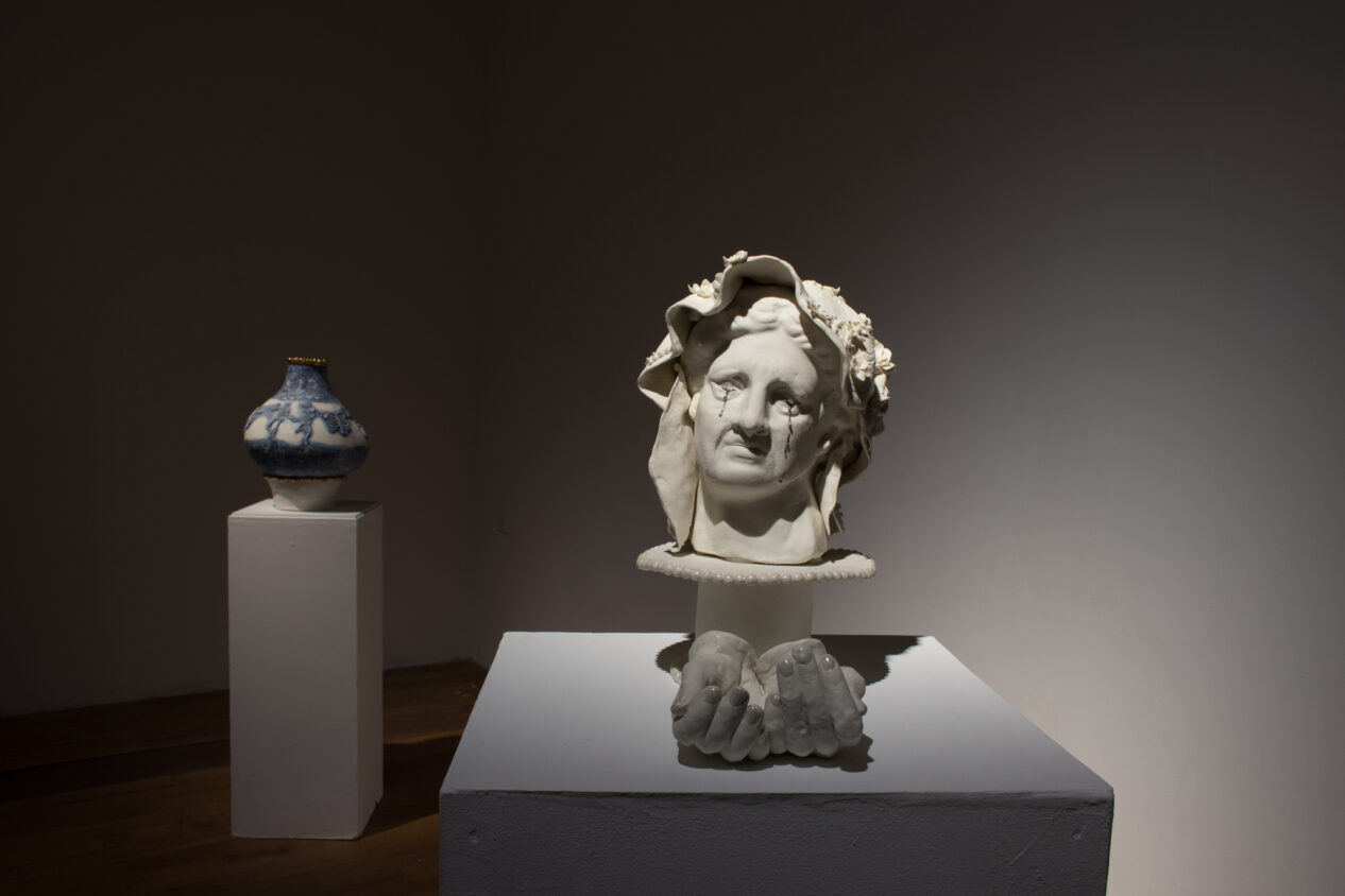 Camilla Hanney’s solo exhibition, ‘Lament’, showed sculptural and installation work, theatrically placed in Pallas Projects/Studios (1 – 16 July). The exhibition reflects, embodies, and presents a history of keening – an act of public grief for the dead, historically carried out by women in Ireland. Upon entry, a group of plinths faced the viewer. The space was still and silent, aside from the consistent and strangely comforting sound of diluted holy water, flowing in the fountain of a sculpture, titled Babble, Gurgle, Flow – an animated and surreal piece, populated by figurines with beaded heads.