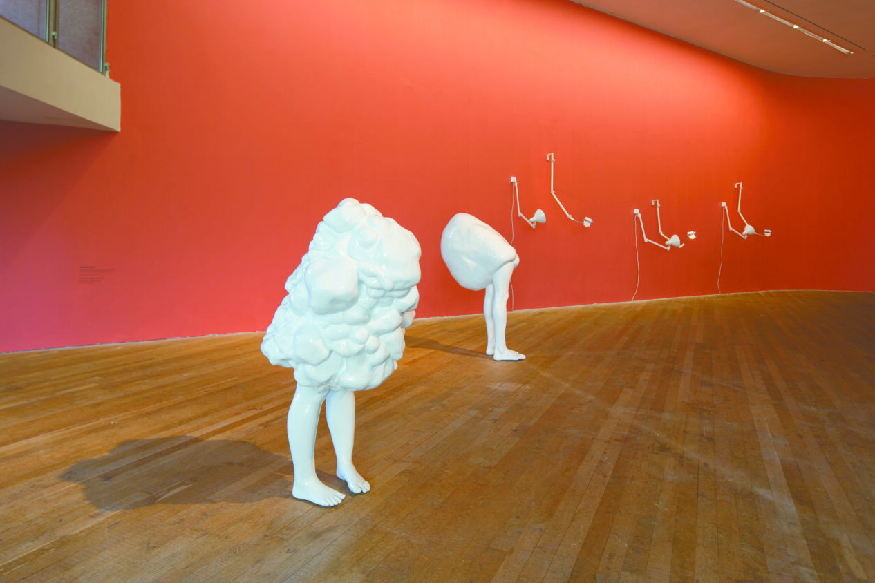 A flesh pink wall forms the backdrop to Siobhan McGibbon’s The cell that consumed me (2014). The work comprises three minimal wall-hung lamps and three mechanical hands, each holding a Viewmaster – a device for viewing slides that simulates binocular depth perception. McGibbon has replaced the film slides with cartoonish drawings depicting bodies merging with trolley legs and bulging, blobby, fleshy growths. Venous Malformation (2012) and Proteus Syndrome (2012) are figures created from fiberglass resin painted an immaculate shiny white; realistic and life-size from feet to above knees, they then meld into bulbous, tumorous blobs. The statues’ pristine material seems at odds with the mutation depicted, exaggerating their grotesqueness. These works embody many of the themes and practices that run through the show: art as research laboratory, interdisciplinary crossover, close looking as a tool for acquiring knowledge, the processed versus the raw, a blending of the alluring and the repulsive.