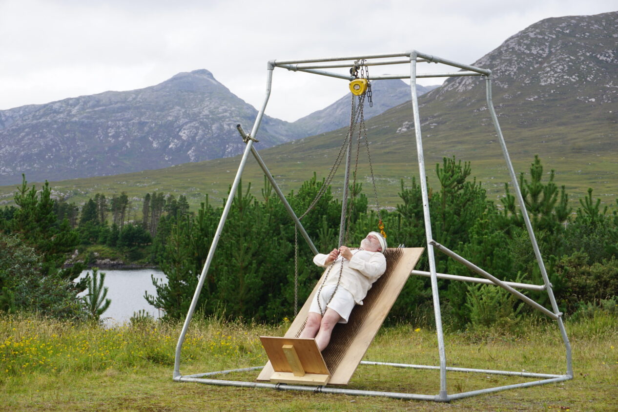 Over the course of the day, Noel Arrigan performed the durational Healing Point (2022). As one entered the grounds, a trapezoidal metal frame overlooked the lake, a diagonally angled bed of nails chained to the structure. Over the course of two hours, Arrigan’s body, clothed in plain linen, reclined upon the nails. His hands gradually pulled at the chain which looped beneath his groin, so as to draw the bed down horizontally and back up again, slowly, centimetres over time, a metronome executing a single, prolonged swoop. The work functioned as a living timepiece, the organism and the product of its labour meeting in pain.